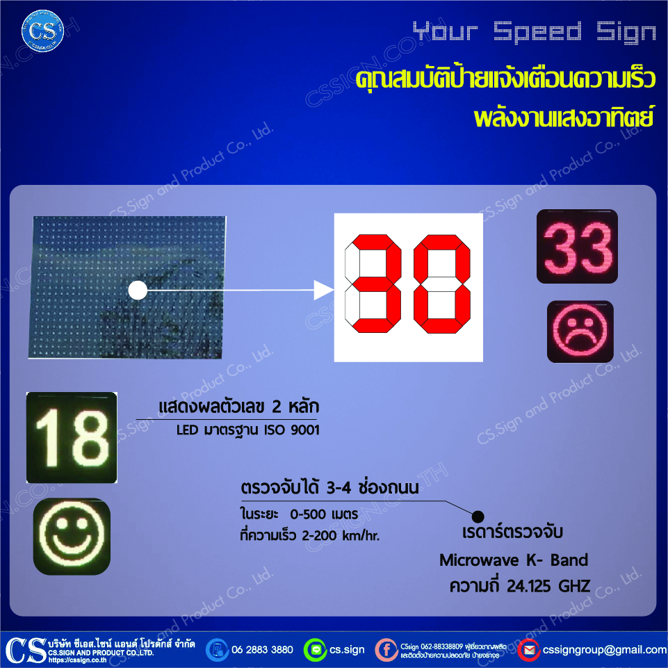 ระยะการตรวจจับรถ 0-500 เมตรได้ 3-4 ช่องทางถนน ตรวจจับความเร็วได้ 2-200 km/hr